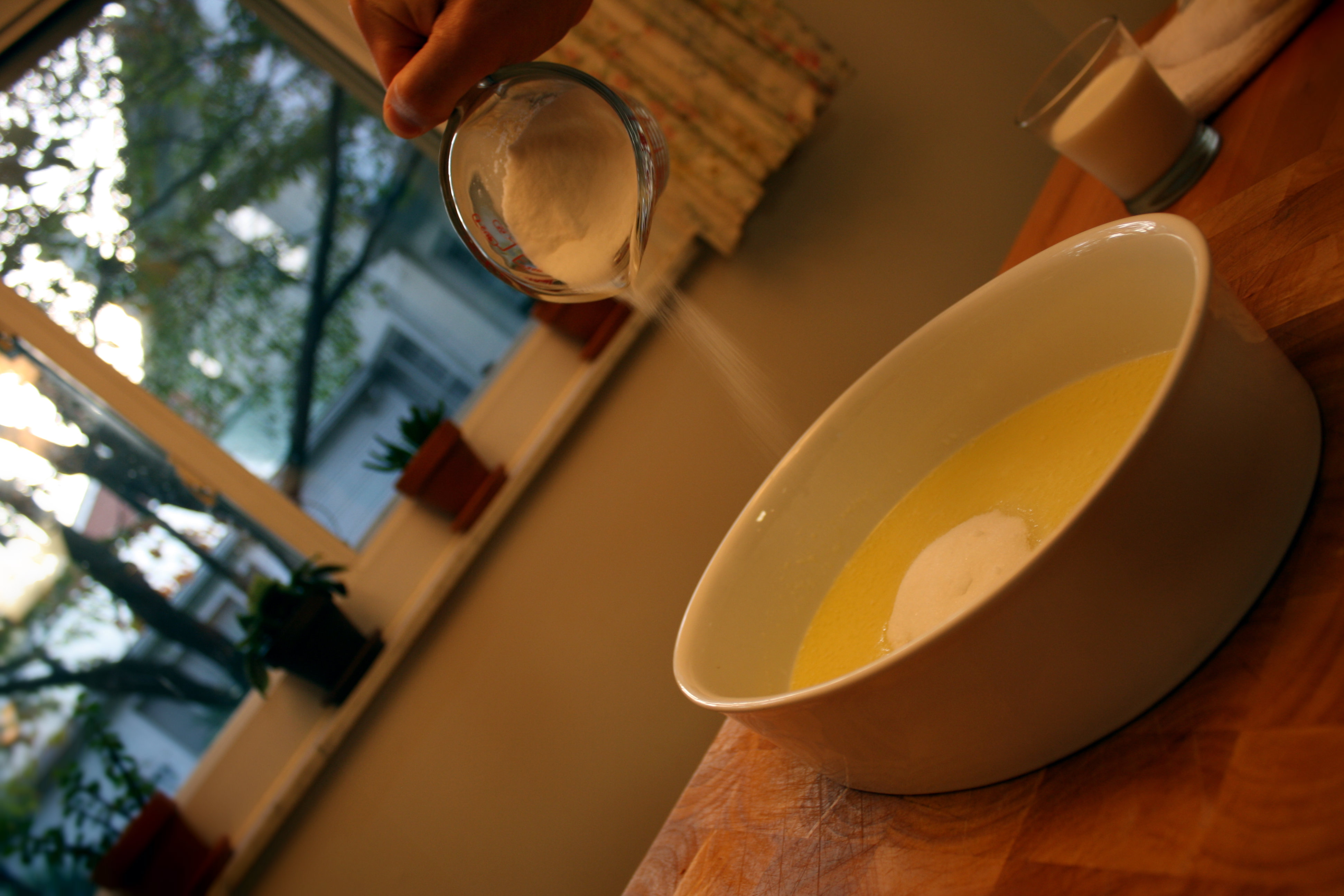 add the flour, milk, and baking powder (for brevity’s sake, we’ve only used these ingredients.  in your kitchen feel free to add vanilla, allspice, nutmeg, cinnamon, or chocolate.  feel obligated to add a dash of salt).