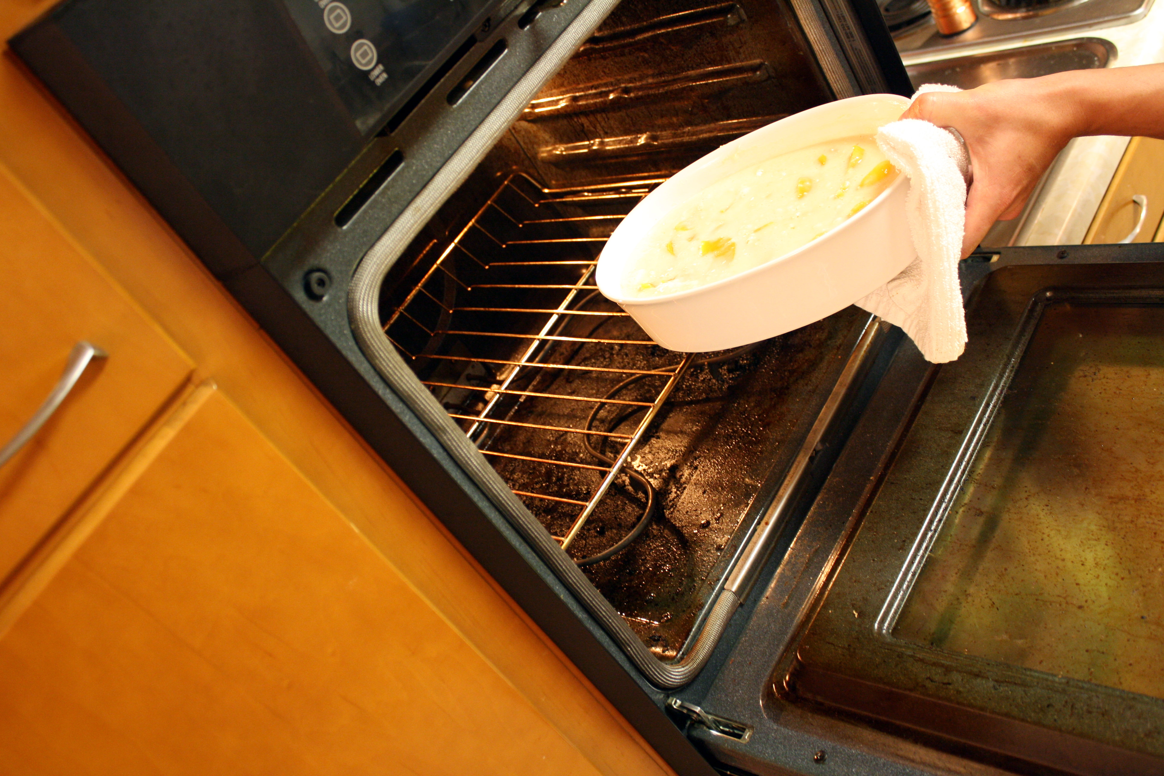 place the stick of butter into a 13 x 9 baking pan and place the pan in the oven. then preheat the oven to 375 degrees.