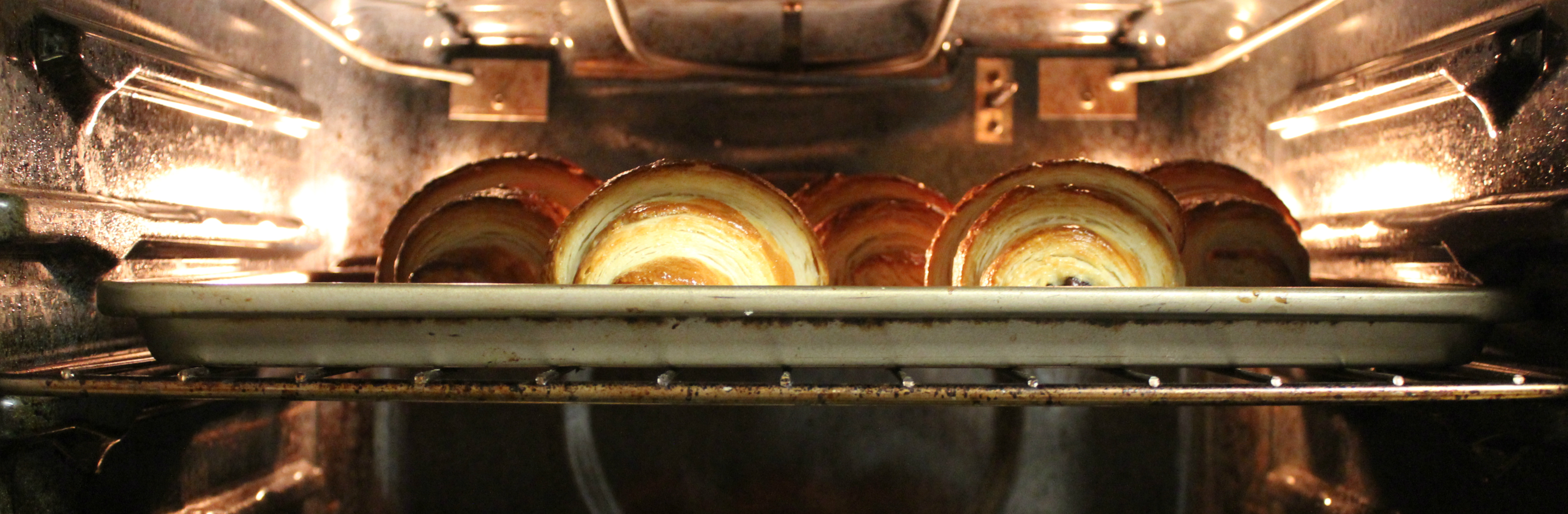 preheat oven to 425. once you’ve rolled and folded as many times as you can stand, roll out the dough into a large (24″x12″) rectangle ~1/4 inch thick. cut into triangles, stuff with chocolate, and roll as shown below.